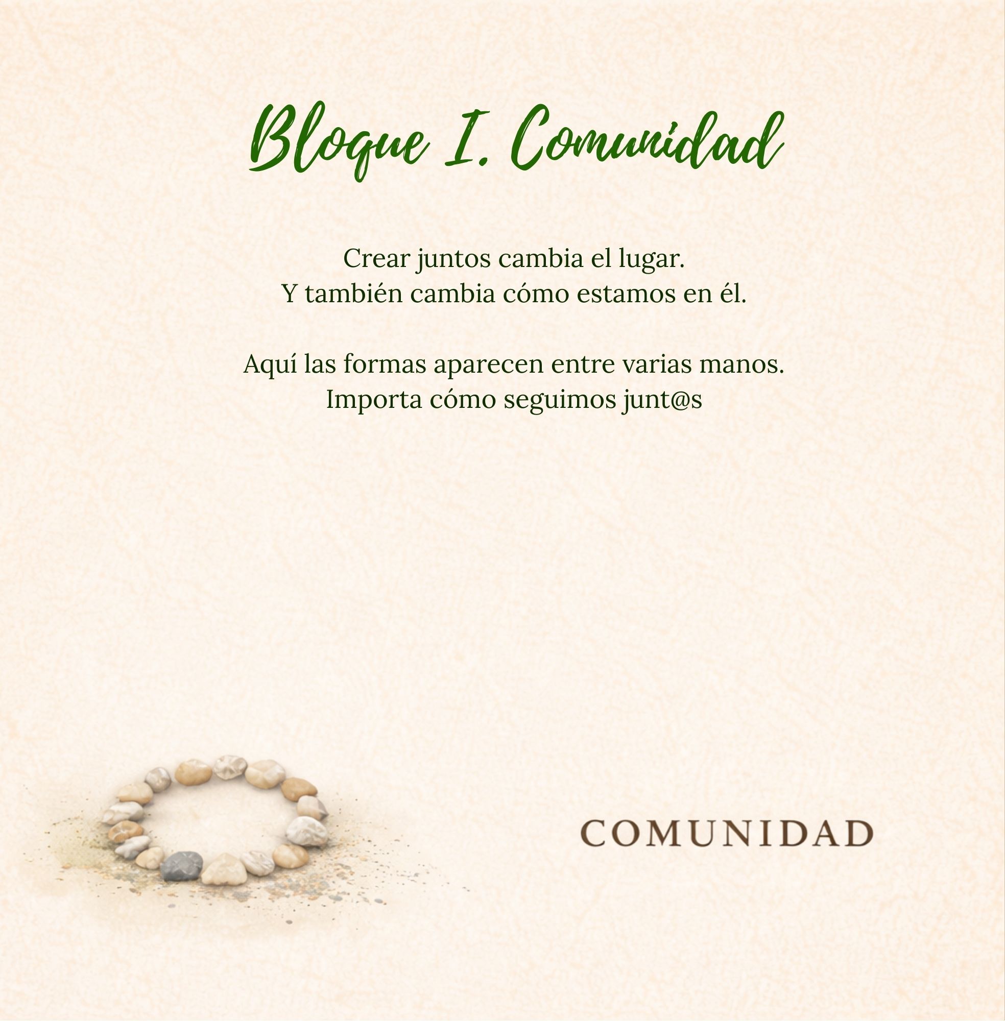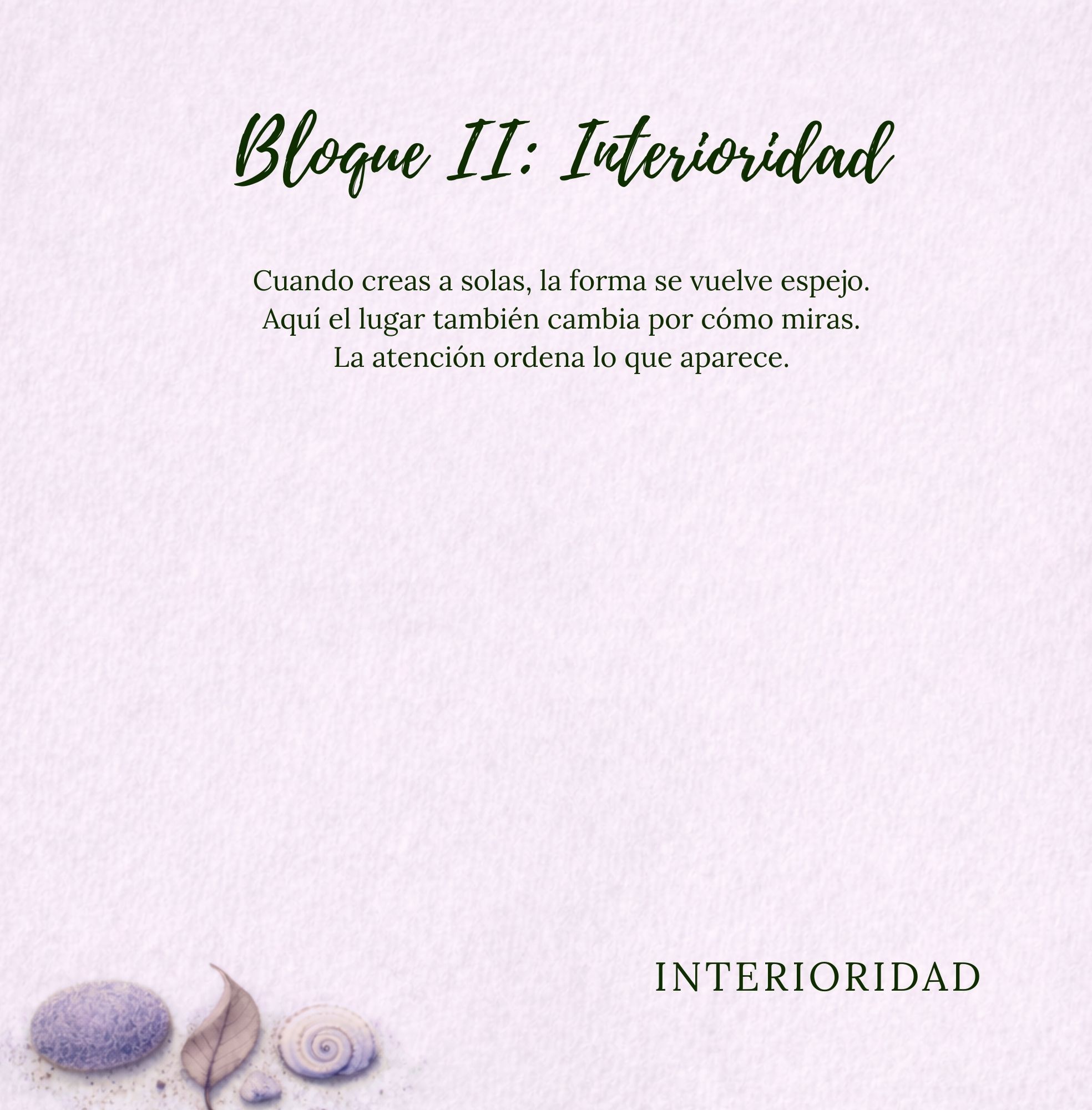 En la parte de Comunidad encontrarás propuestas para crear entre varias manos, compartir una forma común y cuidar el espacio juntos. En la parte de Interioridad encontrarás propuestas para crear a solas, observar con más calma y habitar una experiencia más íntima y contemplativa.