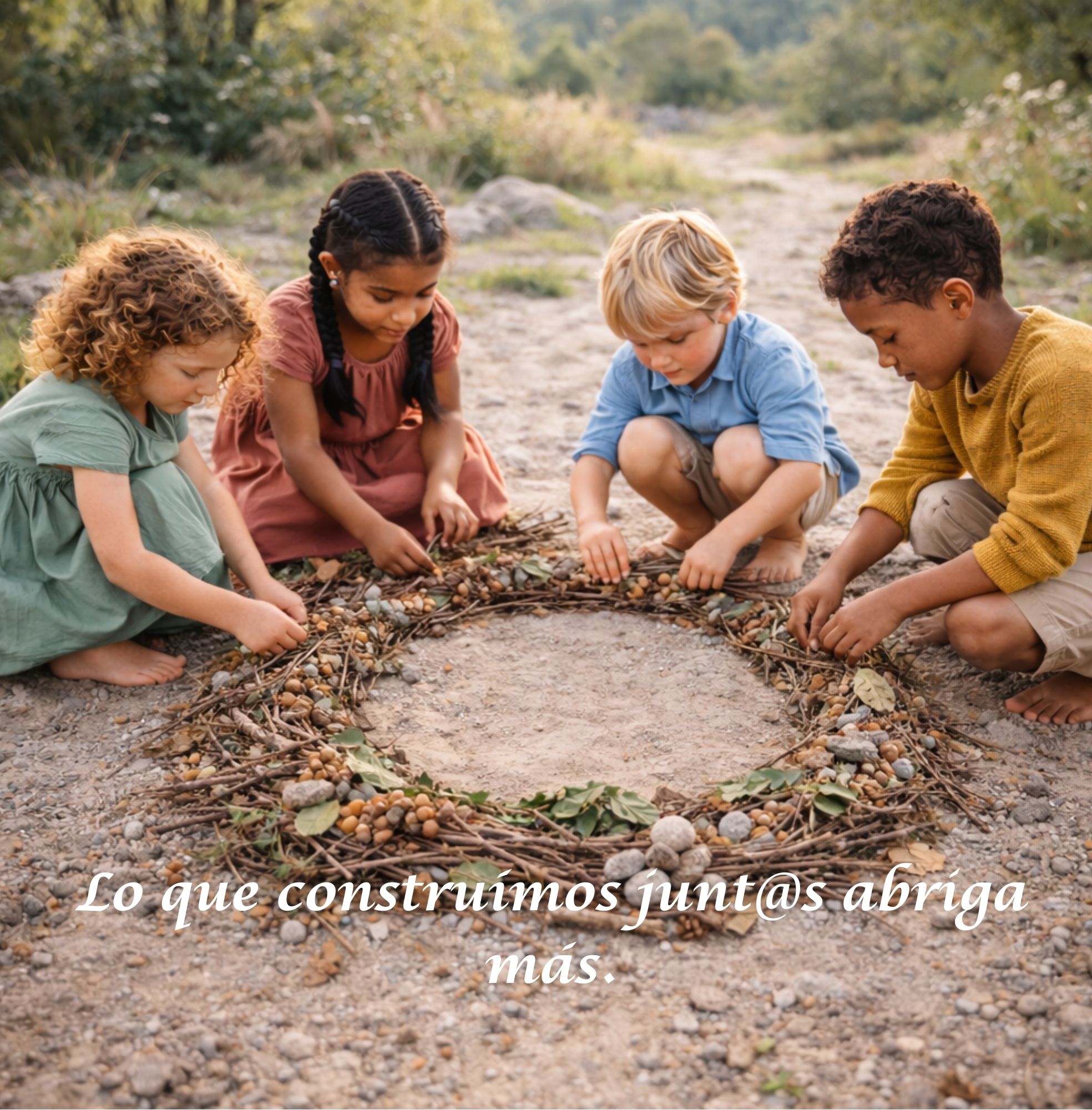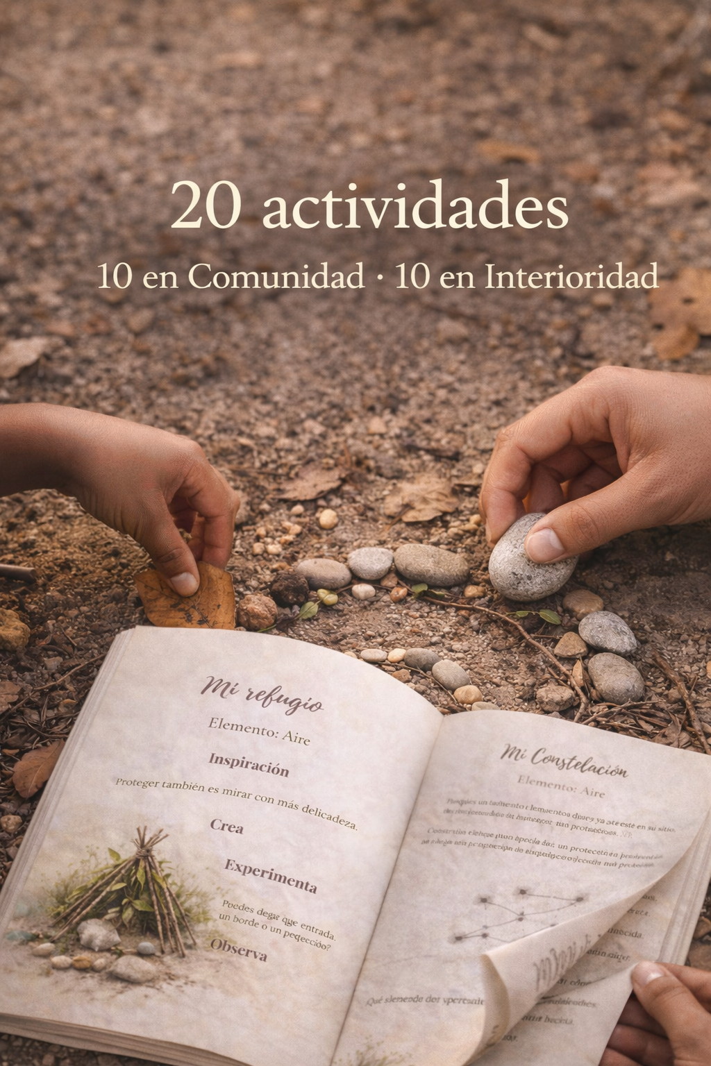 Incluye 20 actividades: 10 en Comunidad y 10 en Interioridad. Son propuestas para crear con piedras, hojas, semillas, arena y ramas, usando lo que el entorno ya ofrece.