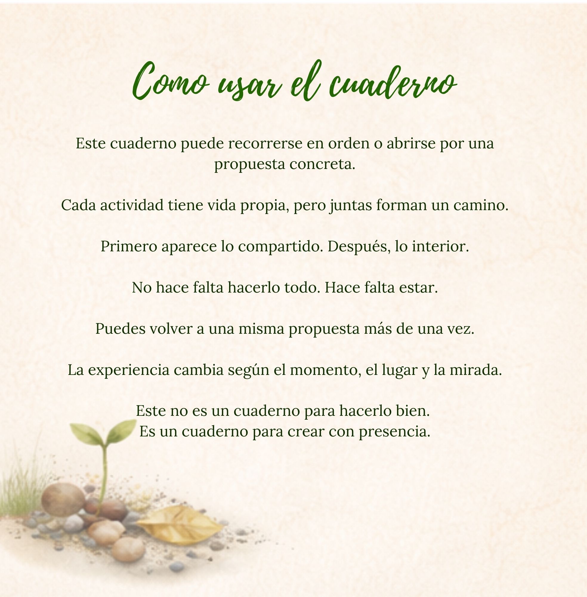 Este cuaderno no está hecho para buscar obras perfectas. Está hecho para crear con presencia. Lo importante no es solo la forma final, sino la experiencia, la observación y la relación con la naturaleza.